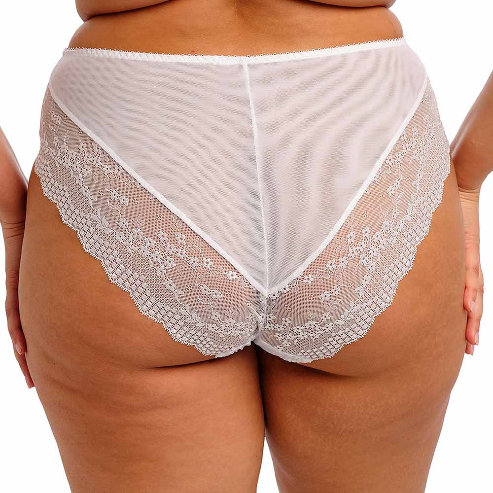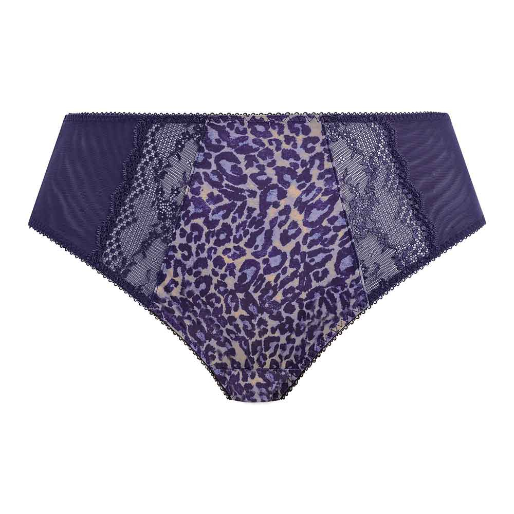 Lucie High Leg Full Briefs by Elomi Lingerie. Full coverage ladies briefs made from stretchy mesh fabric to the front and back. Finished with lace inserts to the back leg and front panels for feminine look. With printed front panel for modesty and higher cut legs for comfort.