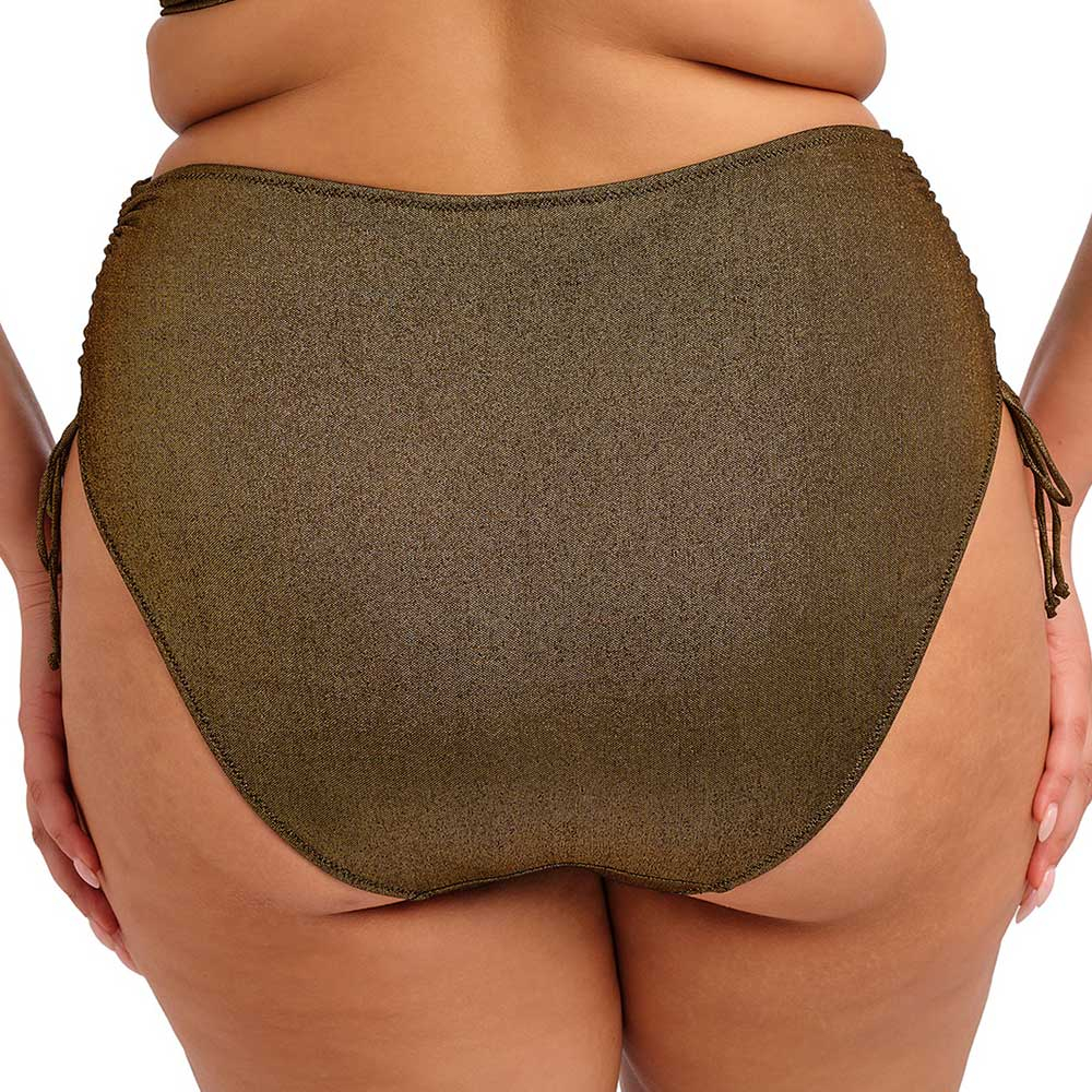 Crafted with soft gold-coloured metallic yarns, they shimmer gently in the sunlight for a refined, elevated finish that feels effortlessly chic. The high waist design offers full coverage with a smoothing effect through the tummy area, while light ruching adds a soft, flattering touch that enhances your silhouette without feeling restrictive.