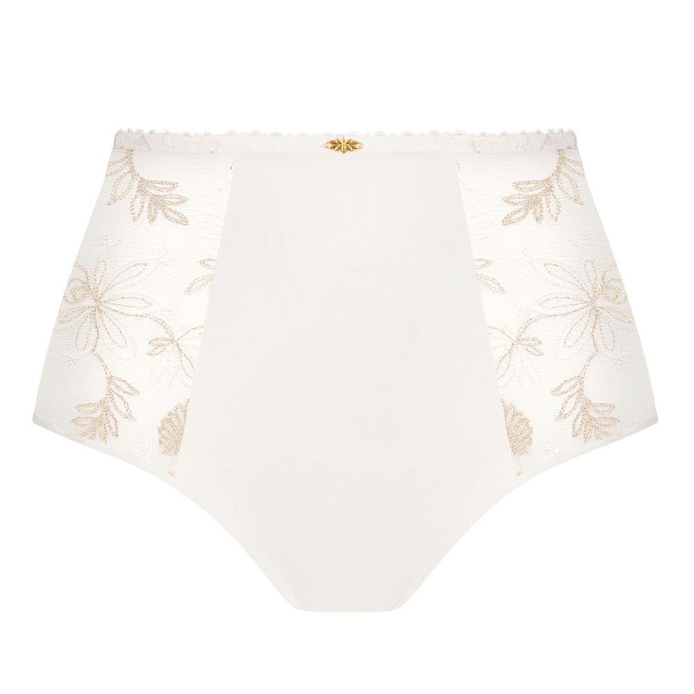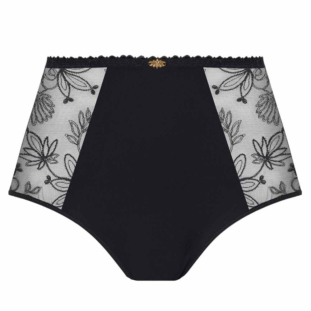 Sizes: 10-S 12-M 14-L 16-XL 18-2XL 20-3XL, High raised briefs, Full coverage, Opaque back and front panel for modesty, Tulle inserts with floral embroidery and sparkling details, Cotton gusset