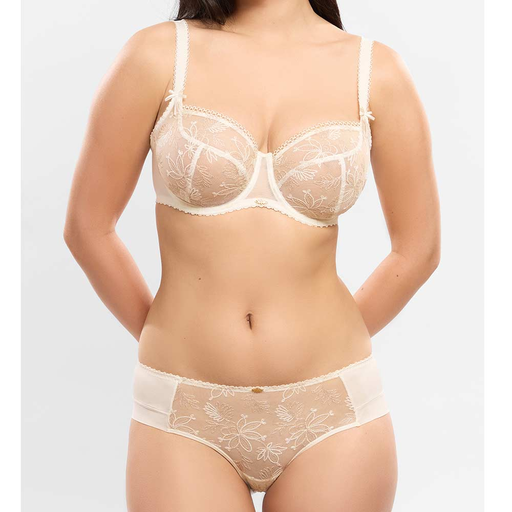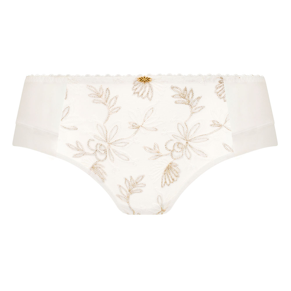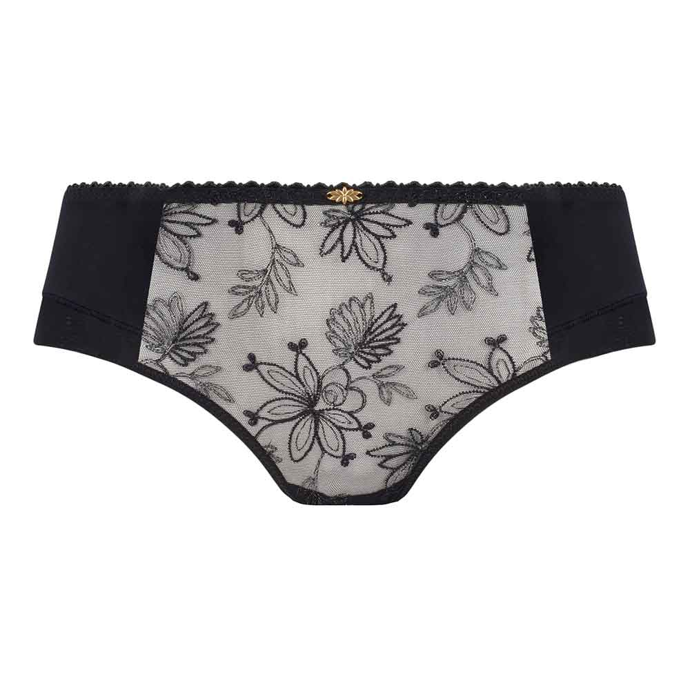 Alix Shorty by Empreinte. Feminine ladies shorts with plain microfibre back and delicate tulle front panel with sophisticated floral embroidery. Designed for everyday comfort to sit low on the hips and finished with contrasting sparkling accents for a romantic look.