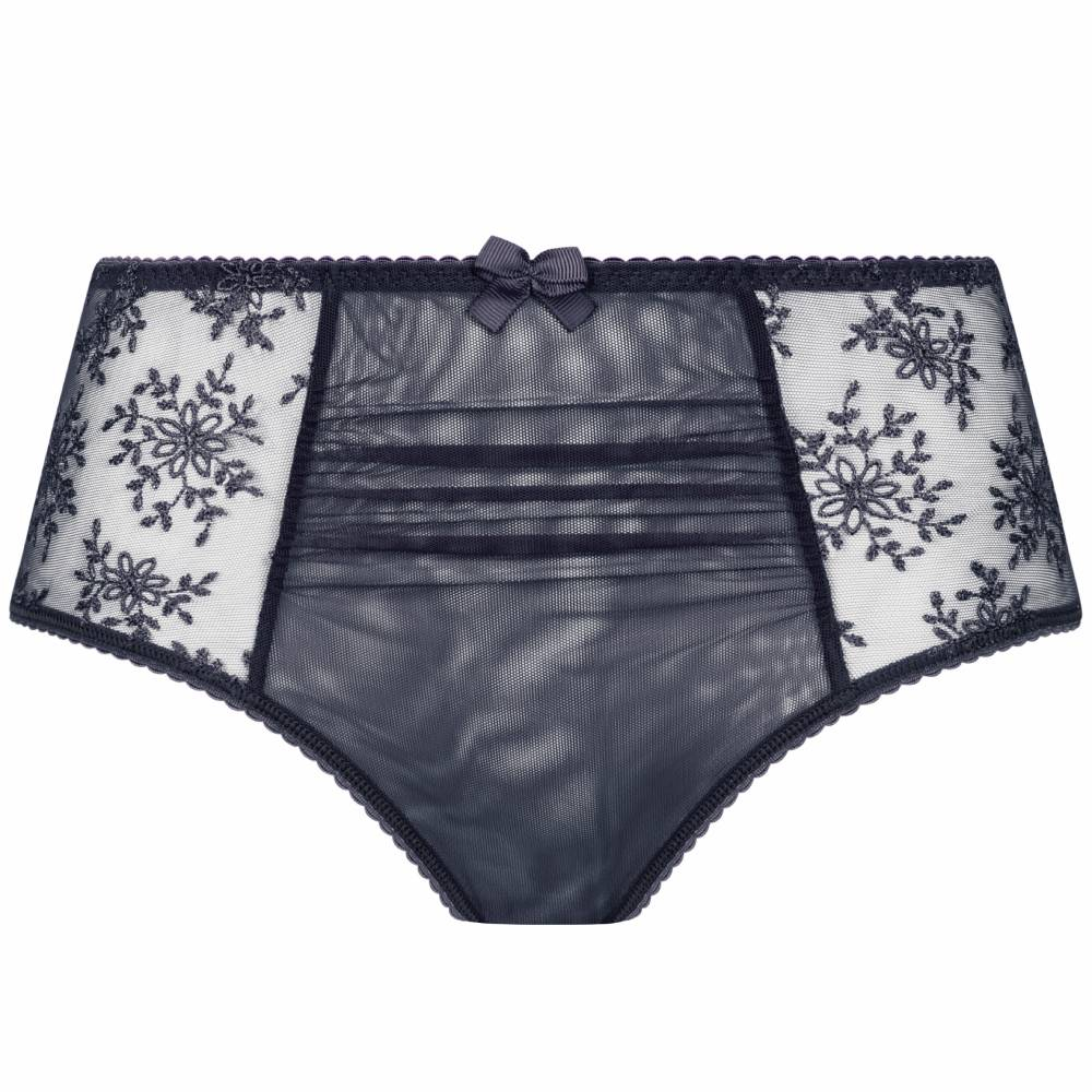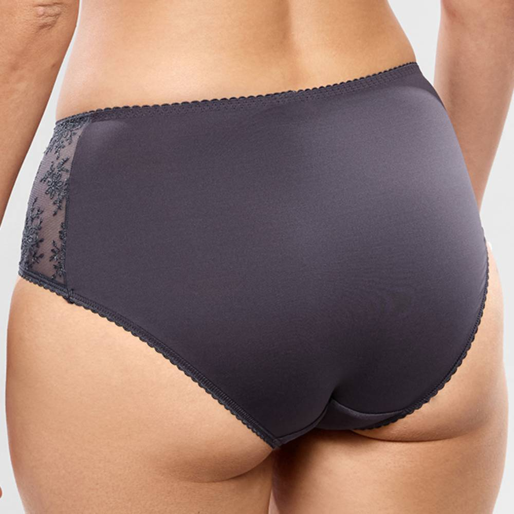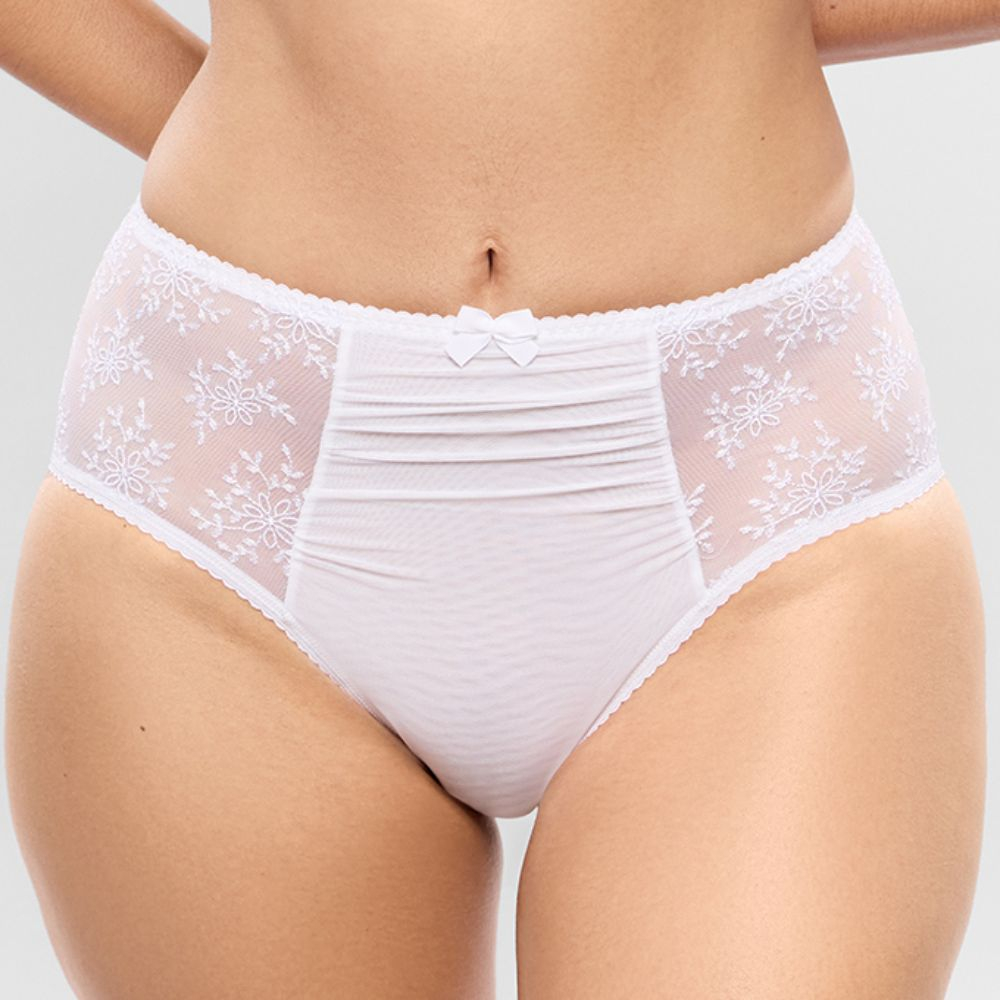 Sizes: 8-XS 10-S 12-M 14-L 16-XL 18-2XL 20-3XL, Full coverage, High waits, Made from plain opaque fabric to the back, Double folded mesh front panel with embroidered sides for an airy look, Cotton Gusset