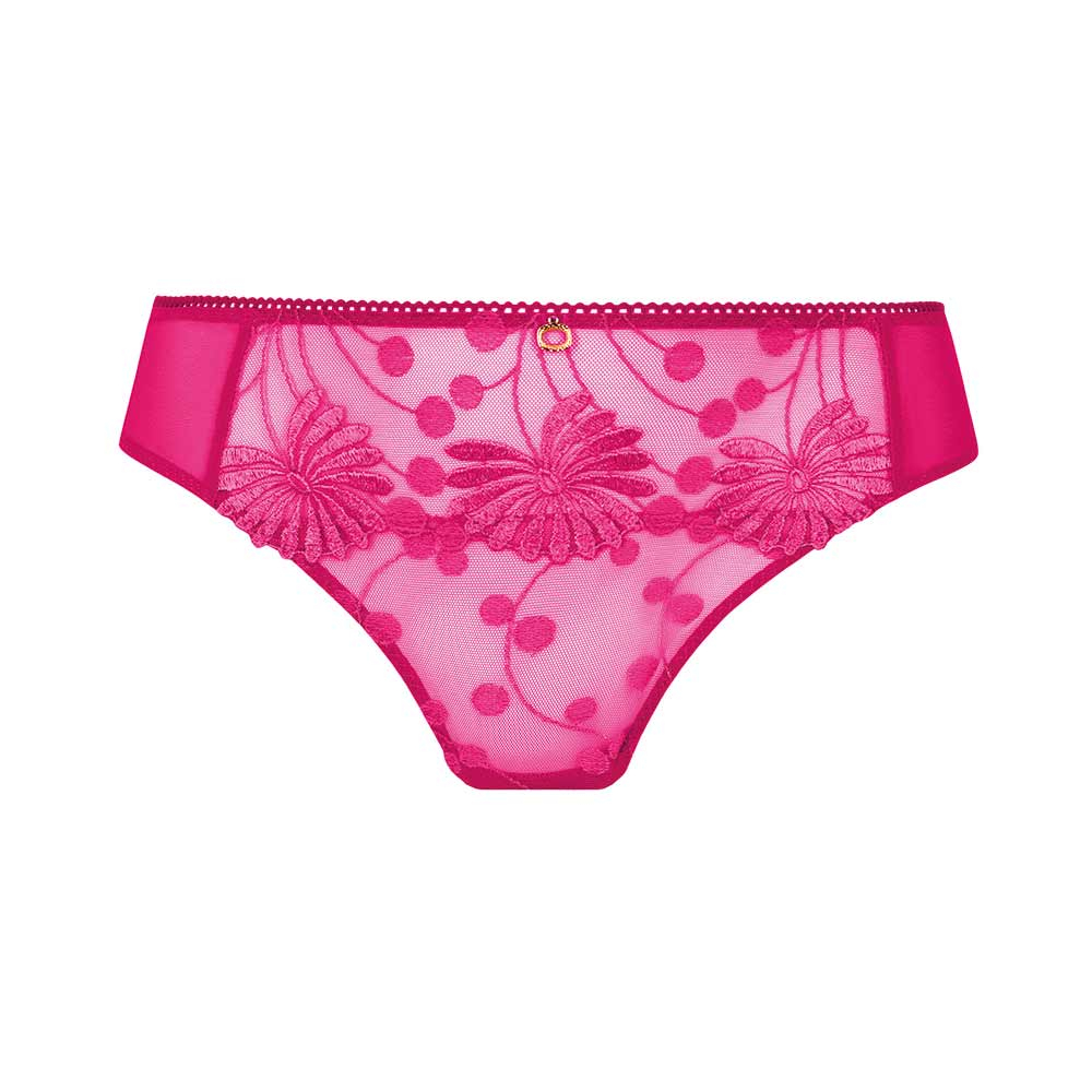 Tess Briefs by Empreinte. Classic shape ladies briefs made from mesh fabric with tulle panel to the front. The front is decorated with delicate polka-dot and sunflower embroidery with fine curved lines for a fashionable, lightweight look