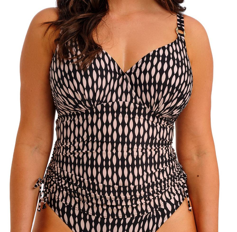 Make a statement this season with the Shell Bay Underwired Wrap Over Cup Tankini Top, a stylish and supportive piece from Fantasie Swim mix-and-match collection. Featuring a trendy graphic design in a sophisticated black and muted blush palette, this tankini top blends fashion-forward detailing with expert fit for fuller busts up to an H cup.