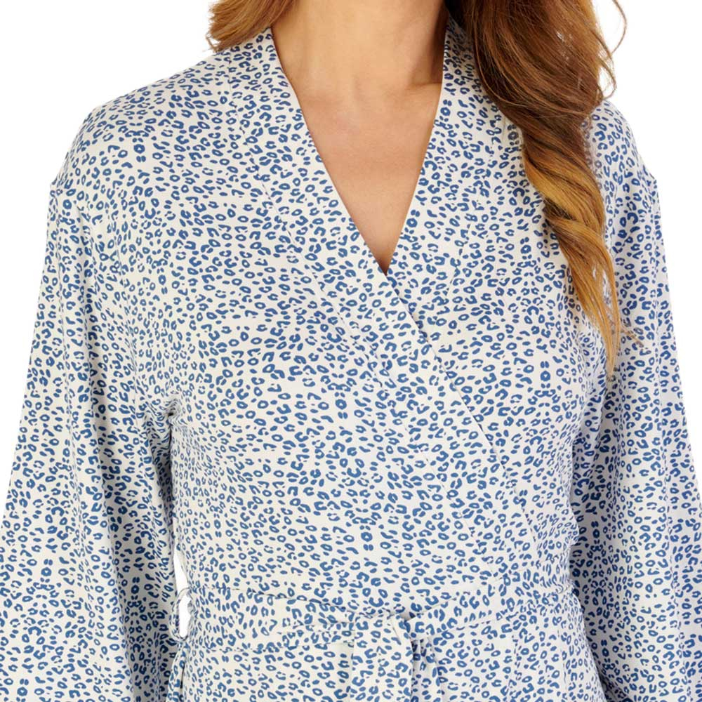 Styled in a delicate animal print, this classic kimono wrap combines timeless design with feminine detail. The wrap-over front fastens with a tie belt for an adjustable fit, while the 3/4 sleeves are finished with lovely lace trim at the cuffs for an extra-soft, elegant touch. With its flattering 42-inch length, this versatile wrap is ideal for lounging at home or completing your bedtime look. Pair it with the matching nightdresses from the same Gaspe collection for a coordinated and stylish nightwear set.