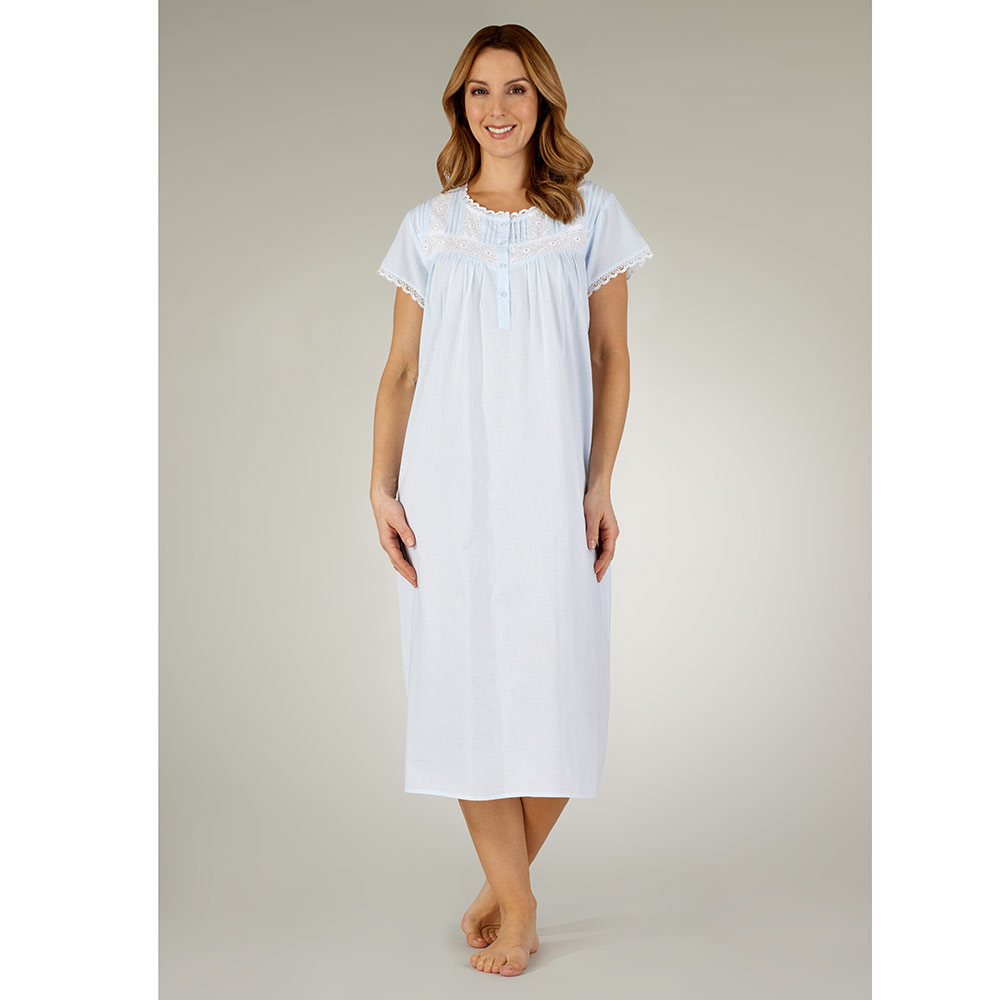 Drift into comfort with timeless elegance in this Embroidered Yoke Short Sleeve Nightdress by Slenderella. Crafted from lightweight, breathable woven cotton, this 45-inch nightdress combines traditional charm with practical comfort. The beautifully detailed embroidered lace yoke adds a feminine touch, while the short sleeves, button opening top, and loose-fitting design ensure ease of movement and all-night comfort. Falling to mid-calf length, this nightdress combines timeless style with everyday practicality, ideal for relaxing evenings and restful sleep, perfect for warmer nights. Whether you're winding down at the end of the day or enjoying a slow morning, this piece is a graceful addition to any nightwear collection.
